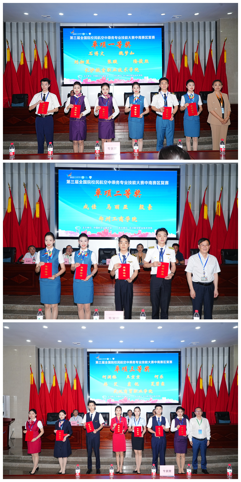本次大赛以“强技能 筑安全 塑文化 展风采”为主题,考核内容参考1+X民航空中服务职业技能等级证书系列教材、中国航空运输协会指定实训教材,设置了理论知识、客舱安全与服务、机上广播、机上应急医疗、机上应急设备五大板块,重点考察客舱安全与服务技能的综合运用情况。在为期三天的赛程中,来自各地院校的参赛选手齐聚长沙,切磋空乘技艺,展示职业素养。随着热烈的掌声,大赛共决出6个单项一等奖,5个单项二等奖,8个单项三等奖,2个团体一等奖,5个团体二等奖,7个团体三等奖、7个团体优秀奖及4个优秀指导老师奖,一大批职校技能高手脱颖而出。其中,我院参赛选手共摘得3个单项一等奖、2个单项二等奖,并荣获大赛团体一等奖,管理学院教师何蕾、苏雅靓荣获优秀指导老师奖。与会领导分别为获奖选手、指导老师和团队颁发证书。
